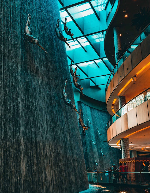 O The Dubai Mall é o segundo maior centro comercial do mundo em área total e o vigésimo sexto em área útil para aluguel. Está localizado no complexo Burj Khalifa e foi inaugurado em 4 de novembro de 2008.Foi inaugurado em 4 de novembro de 2008. O shopping possui 1.200 lojas, hotel, 22 salas de cinemas multiplex stadium, uma praça de alimentação com 160 operações fast-food e 120 restaurantes, uma pista de patinação (Dubai Ice Rink) e um dos maiores aquários do mundo com mais de 33.000 animais marinhos em exposição